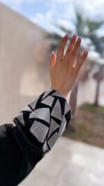 عباية صيفية أنيقة بقصة نصف كلوش في اللون السكري، تتميز بخامتها الخفيفة والباردة مثل اللينين القطني لتناسب الصيف، وتزدان بتطريزات سكرية على التل لإضافة لمسة من الفخامة والنعومة، مع أكمام مربعة أو واسعة تناسب تصميمها البسيط والمريح، مما يجمع بين الاحتشام والأناقة العصرية.